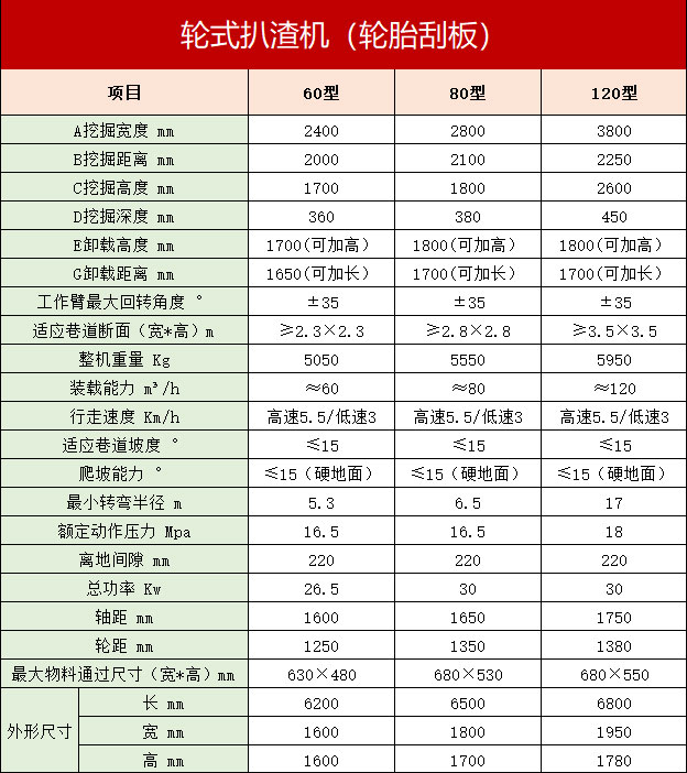 轮式扒渣机(又名挖掘式装载机),主要应用于空间狭窄的洞采作业,如金属矿,饮水巷道等,其作用是采集各工程的碎石土料并输送、装车。本机靠轮胎推进铲取岩石并通过铲斗将石料扒进自身的皮带输送机,输送机从尾部将挖取的岩石渣料卸入自卸汽车、矿车或其他装载设备。同时也可以利用反铲挖掘臂扒取远处的岩石,也可以用铲斗来清理工作面。